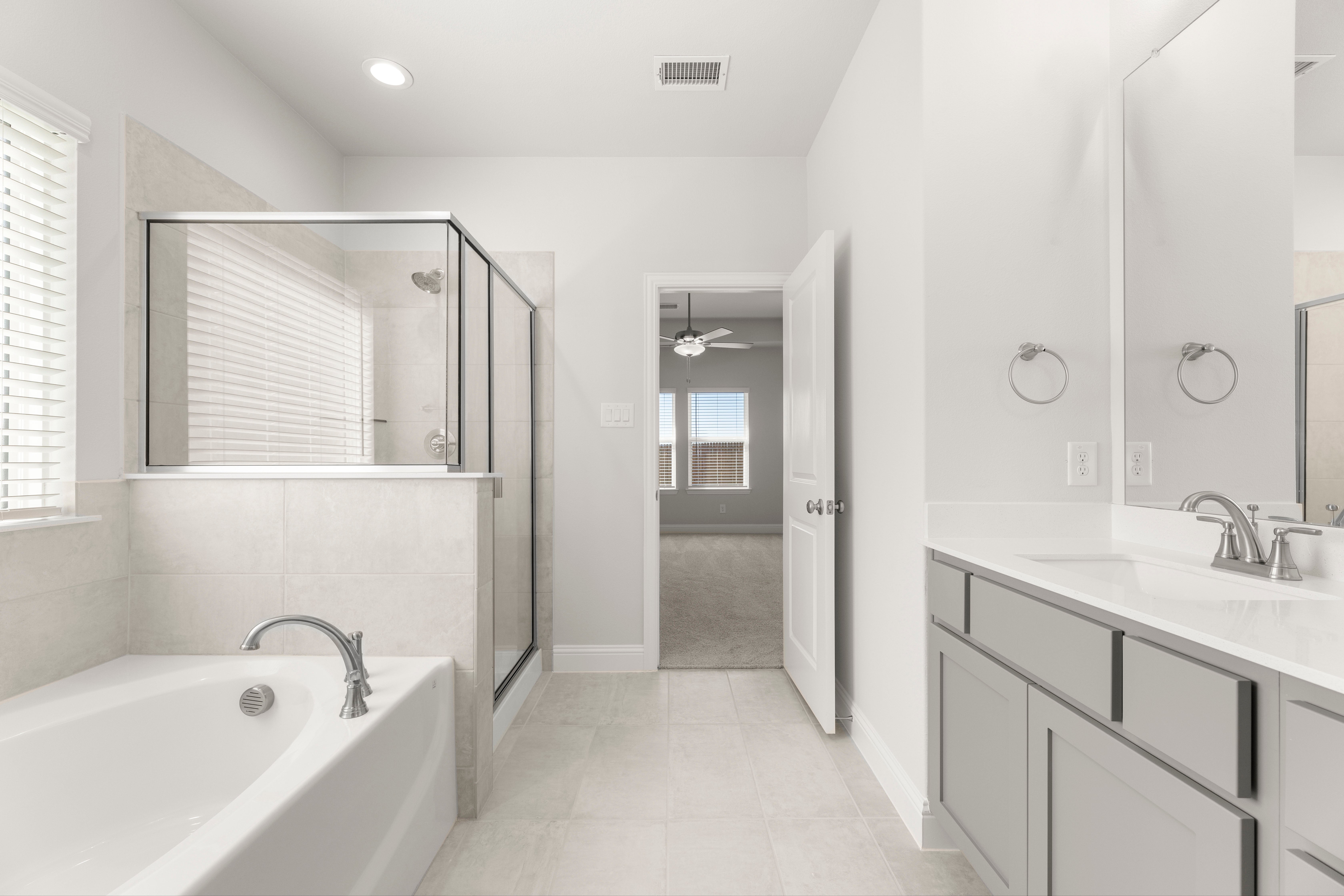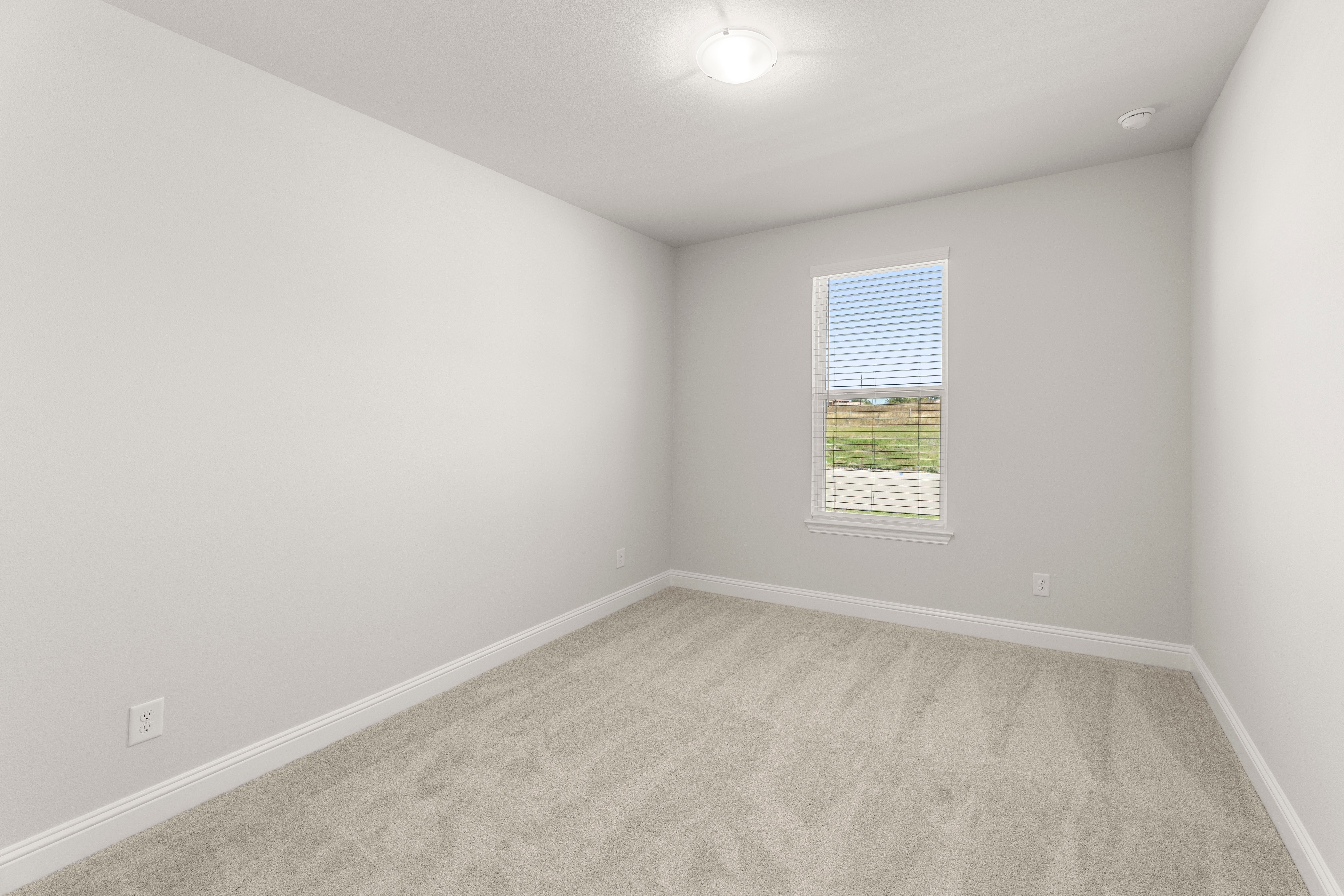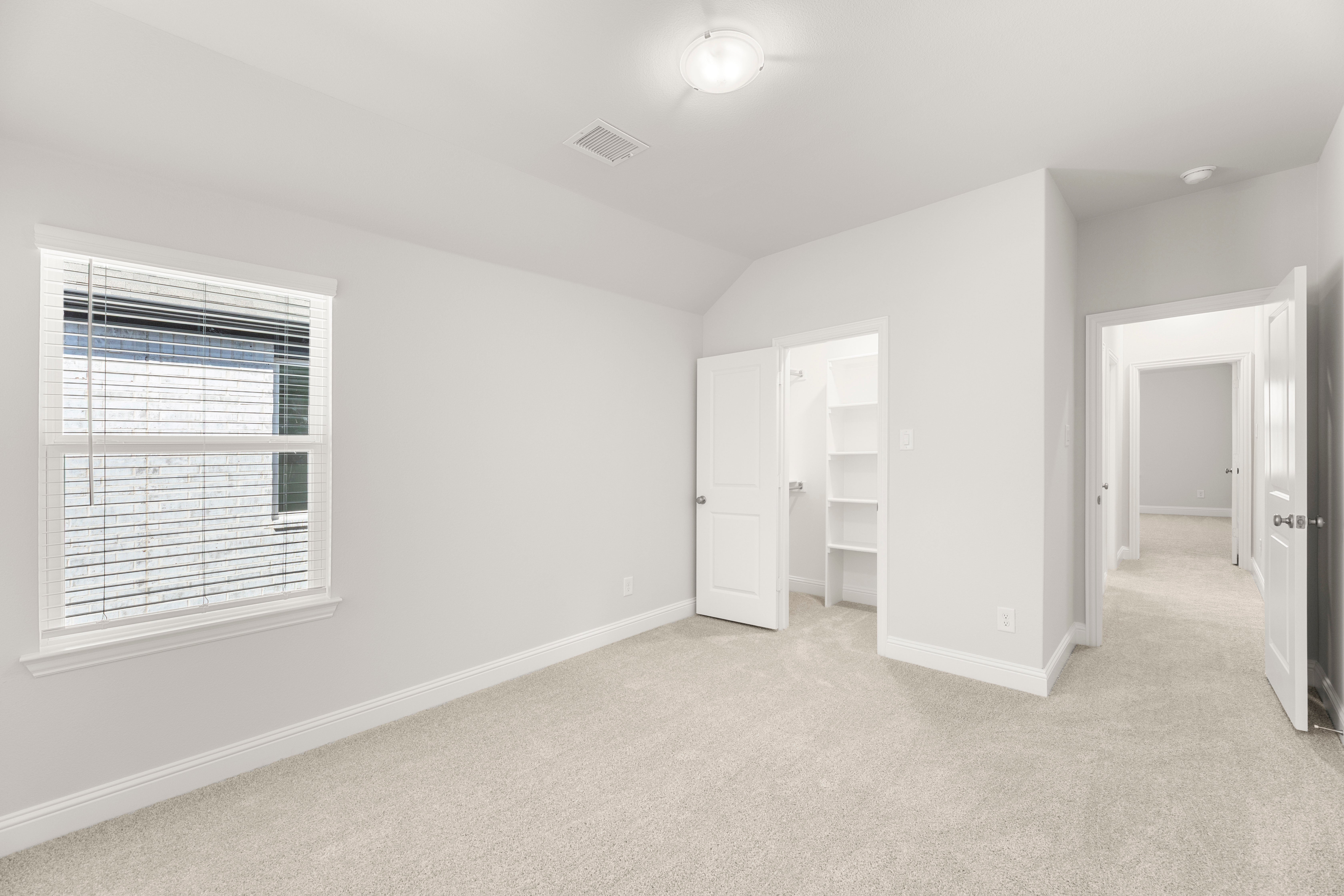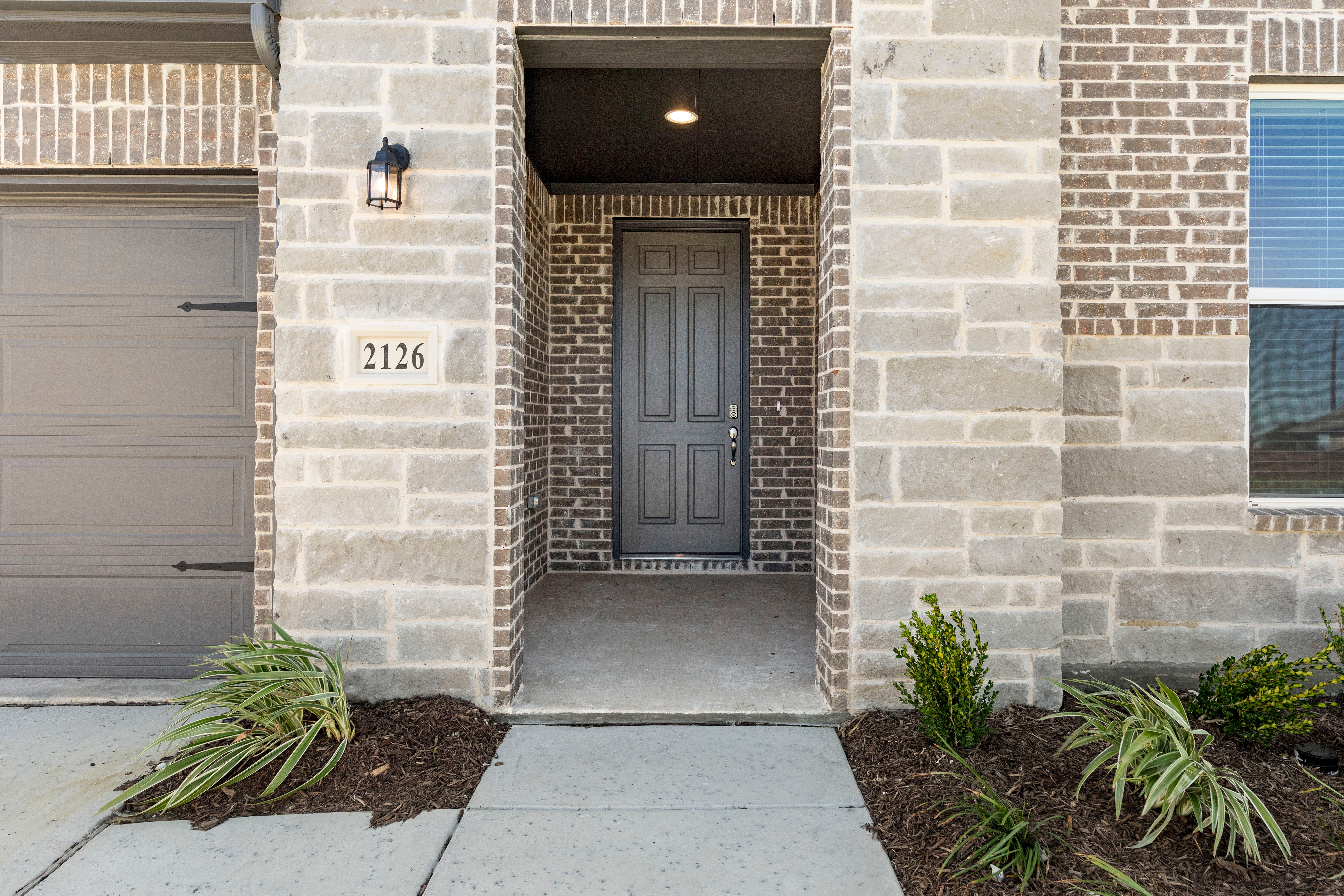 The new two-story home by RockWell Homes offers a spacious and versatile design, featuring 5 bedrooms and 4 bathrooms, along with a dining room, home office, gameroom, and a 2-car garage. The exterior showcases a blend of full brick and stone, complemented by a covered porch and dual-pane energy-efficient windows. Inside, the open-concept layout places the living, kitchen, and dining areas at the back of the home, with the kitchen boasting an island with bar stool seating, solid surface countertops, stainless steel appliances, range, dishwasher, microwave, ceramic tile backsplash, 42-inch cabinets, Delta faucet, recessed can lighting and a walk-in pantry. The living area is bathed in natural light from multiple dual-pane windows. The primary suite, conveniently located on the first floor, features a garden tub, ceramic tile shower with glass enclosure, dual sink vanity, walk-in closet, and upscale Delta faucets. A guest suite is also on the main floor with a full bathroom. Upstairs, secondary bedrooms all include walk-in closets, and the secondary bathrooms offer ceramic tile flooring and tub/shower surround. Additional highlights include a full sprinkler system, landscaping package, full gutters, garage door opener, ceramic tile utility area, vaulted ceilings, fully fenced in private back yard and a new home warranty. An optional media room is available to enhance your living experience even further.