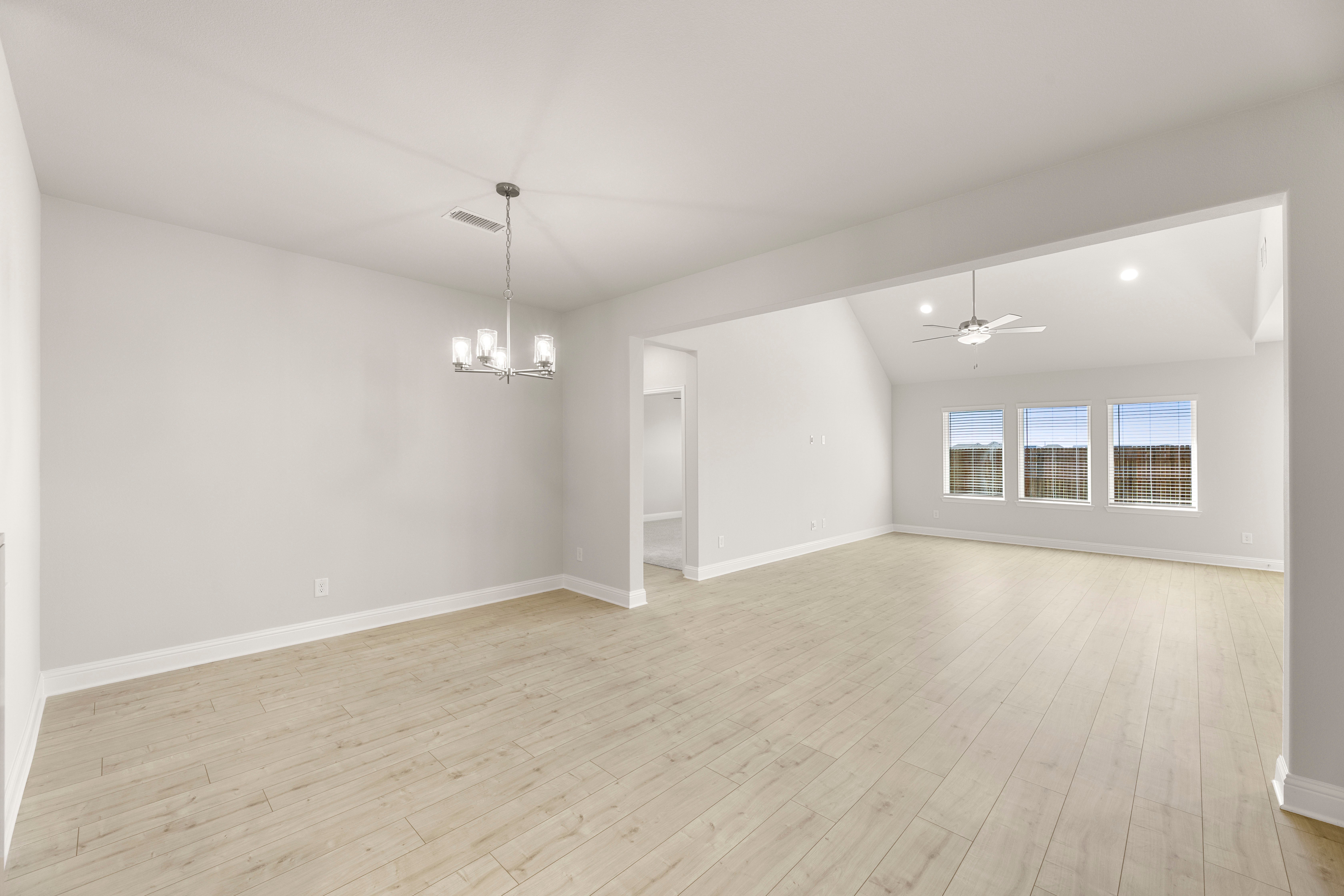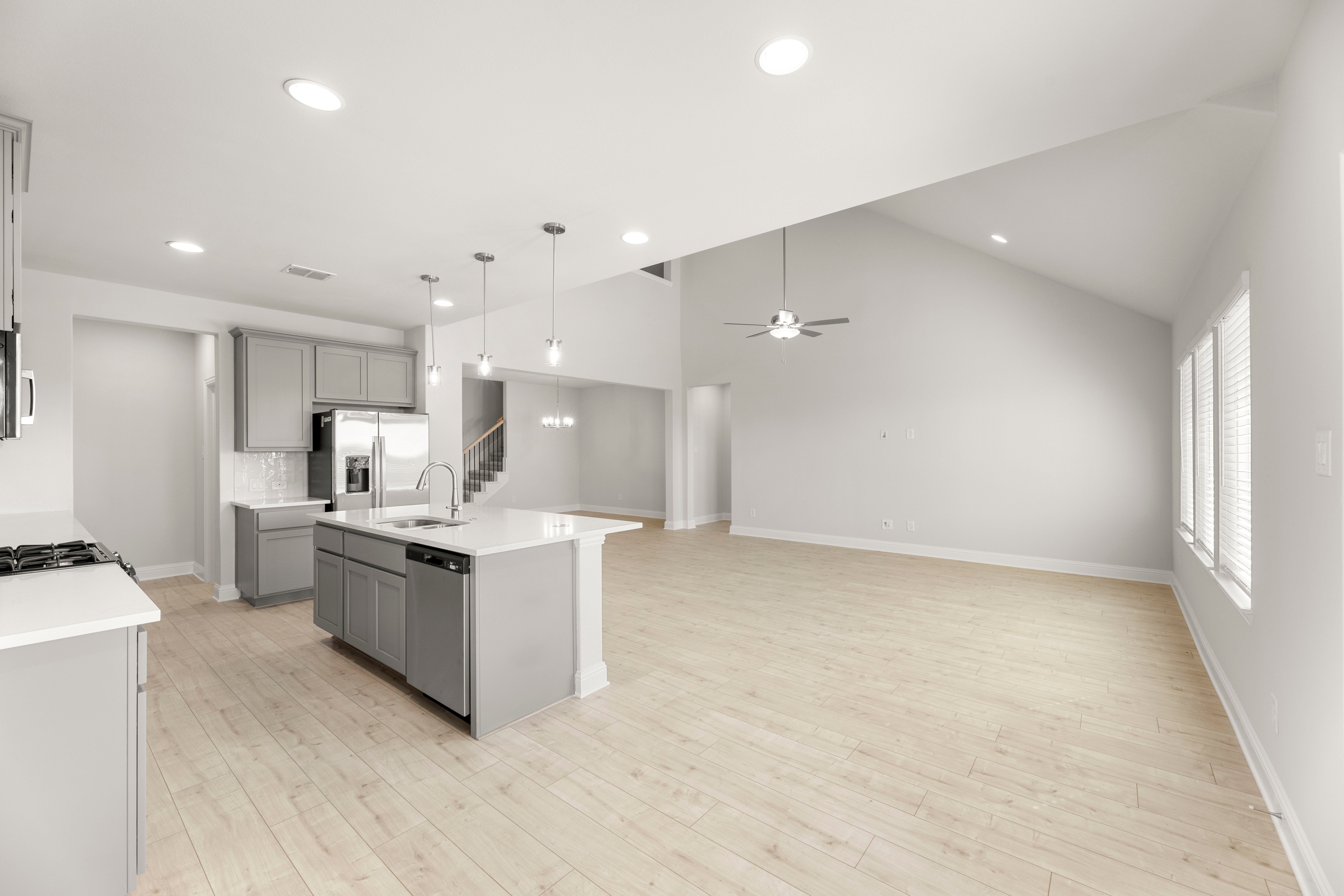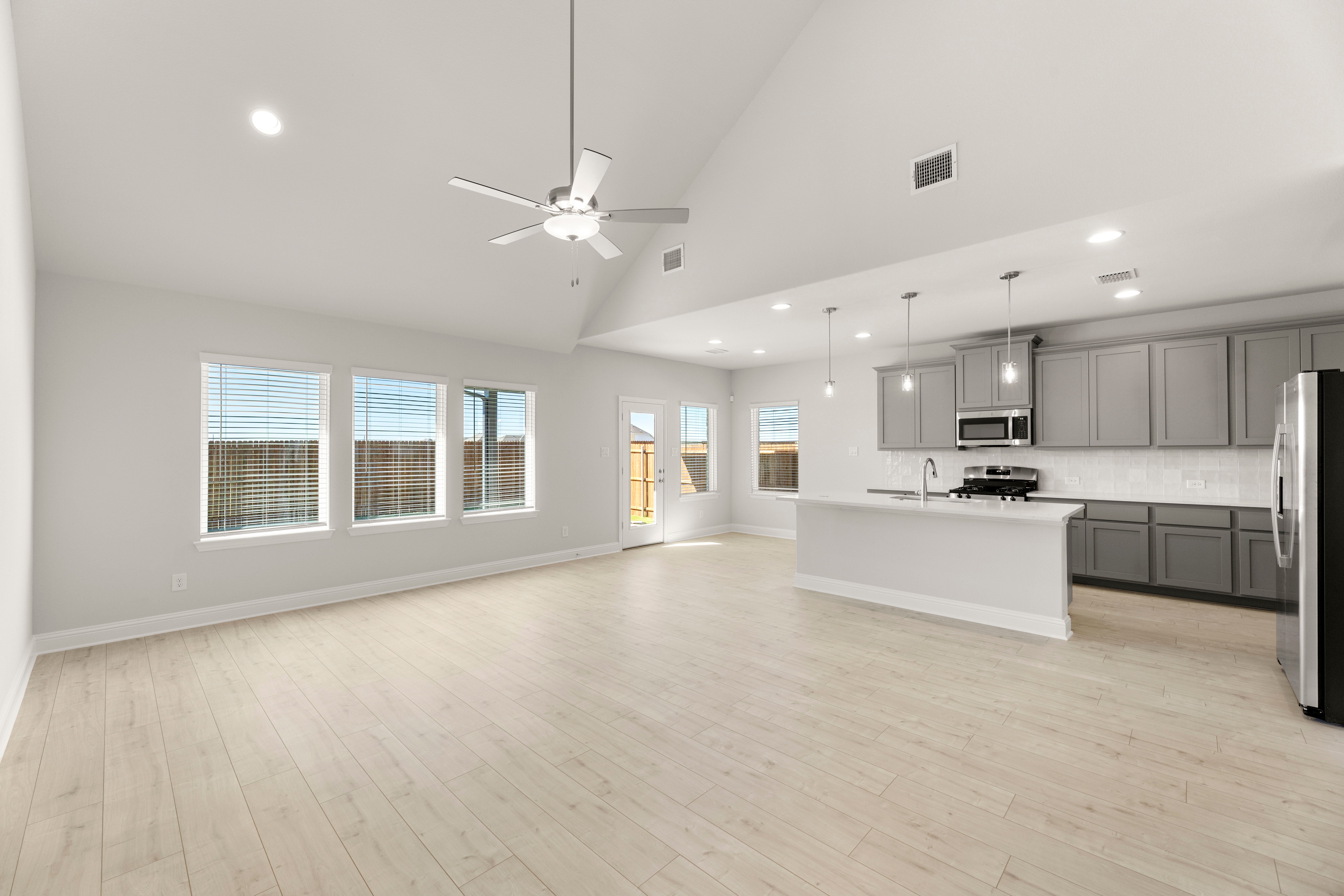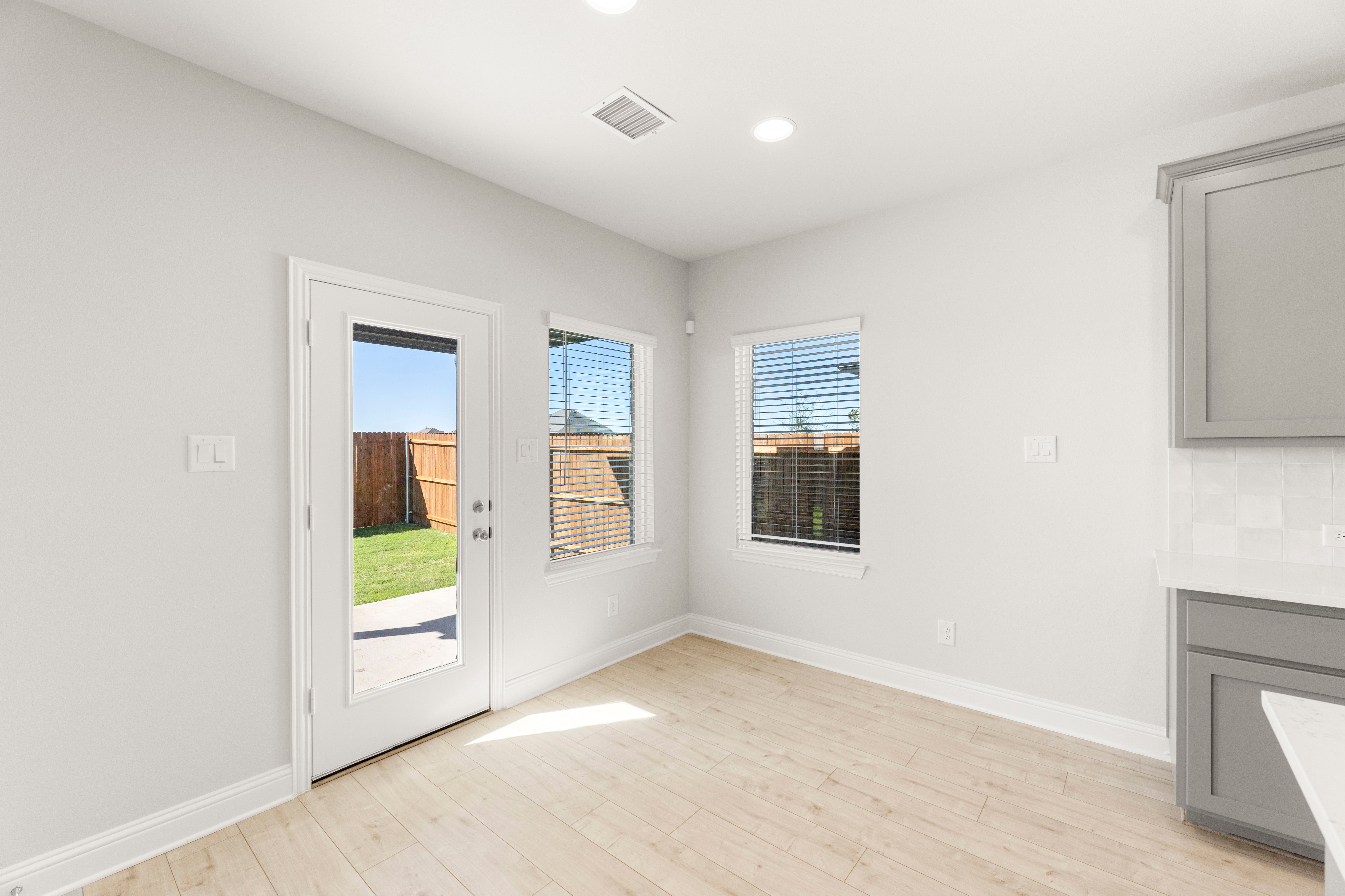 The new two-story home by RockWell Homes offers a spacious and versatile design, featuring 5 bedrooms and 4 bathrooms, along with a dining room, home office, gameroom, and a 2-car garage. The exterior showcases a blend of full brick and stone, complemented by a covered porch and dual-pane energy-efficient windows. Inside, the open-concept layout places the living, kitchen, and dining areas at the back of the home, with the kitchen boasting an island with bar stool seating, solid surface countertops, stainless steel appliances, range, dishwasher, microwave, ceramic tile backsplash, 42-inch cabinets, Delta faucet, recessed can lighting and a walk-in pantry. The living area is bathed in natural light from multiple dual-pane windows. The primary suite, conveniently located on the first floor, features a garden tub, ceramic tile shower with glass enclosure, dual sink vanity, walk-in closet, and upscale Delta faucets. A guest suite is also on the main floor with a full bathroom. Upstairs, secondary bedrooms all include walk-in closets, and the secondary bathrooms offer ceramic tile flooring and tub/shower surround. Additional highlights include a full sprinkler system, landscaping package, full gutters, garage door opener, ceramic tile utility area, vaulted ceilings, fully fenced in private back yard and a new home warranty. An optional media room is available to enhance your living experience even further.