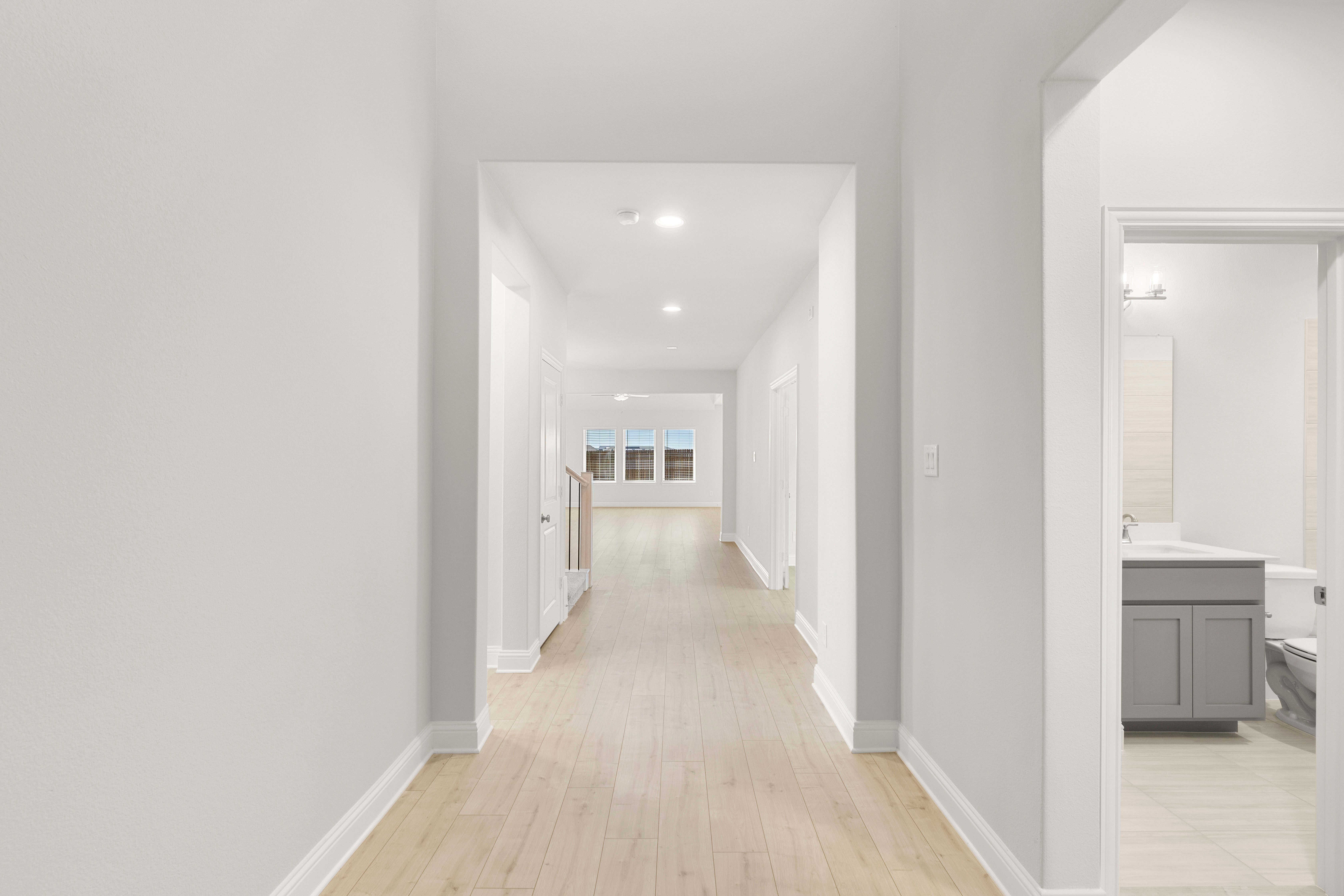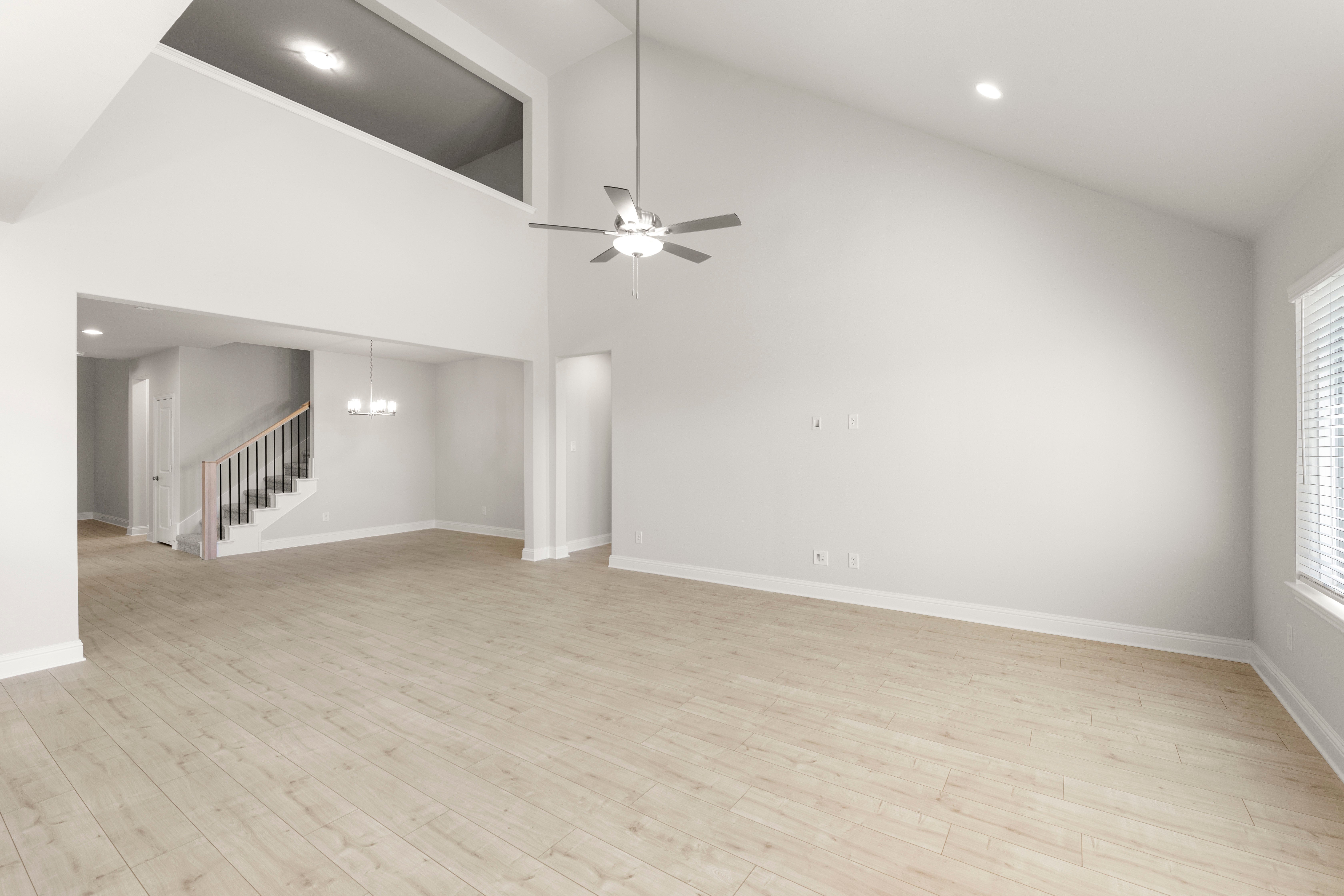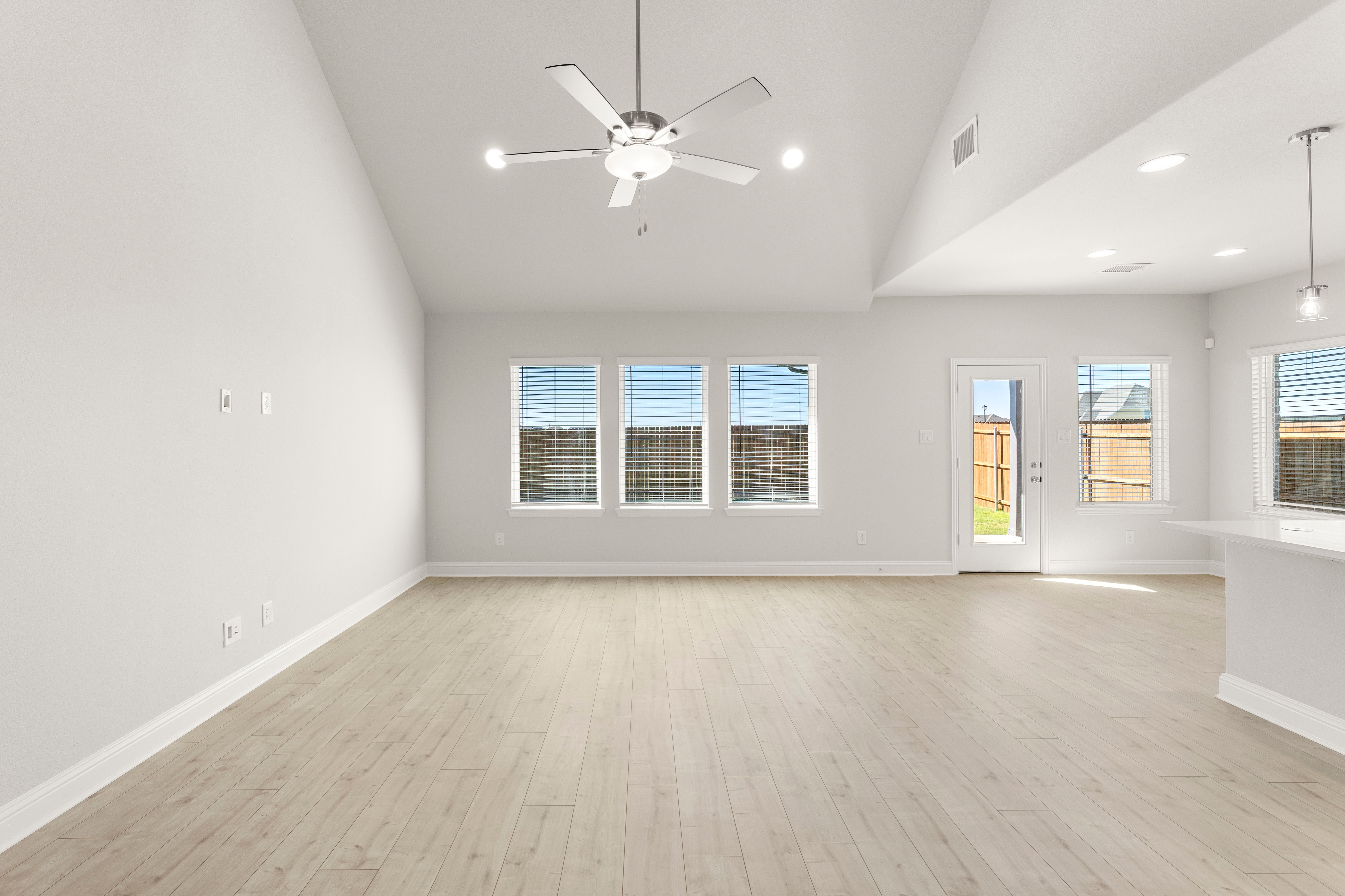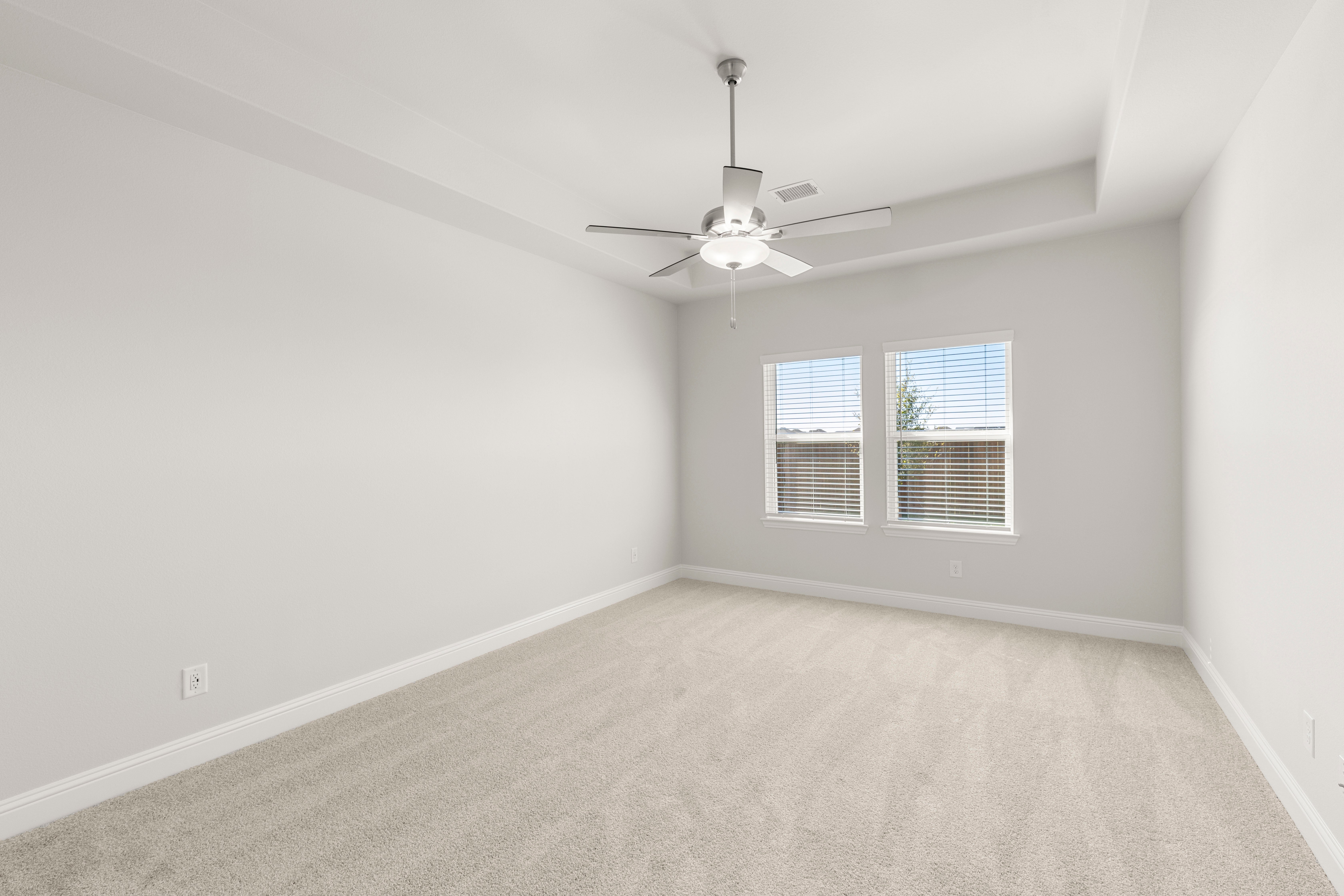The new two-story home by RockWell Homes offers a spacious and versatile design, featuring 5 bedrooms and 4 bathrooms, along with a dining room, home office, gameroom, and a 2-car garage. The exterior showcases a blend of full brick and stone, complemented by a covered porch and dual-pane energy-efficient windows. Inside, the open-concept layout places the living, kitchen, and dining areas at the back of the home, with the kitchen boasting an island with bar stool seating, solid surface countertops, stainless steel appliances, range, dishwasher, microwave, ceramic tile backsplash, 42-inch cabinets, Delta faucet, recessed can lighting and a walk-in pantry. The living area is bathed in natural light from multiple dual-pane windows. The primary suite, conveniently located on the first floor, features a garden tub, ceramic tile shower with glass enclosure, dual sink vanity, walk-in closet, and upscale Delta faucets. A guest suite is also on the main floor with a full bathroom. Upstairs, secondary bedrooms all include walk-in closets, and the secondary bathrooms offer ceramic tile flooring and tub/shower surround. Additional highlights include a full sprinkler system, landscaping package, full gutters, garage door opener, ceramic tile utility area, vaulted ceilings, fully fenced in private back yard and a new home warranty. An optional media room is available to enhance your living experience even further.